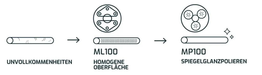 ML100 is now finishing raw tubes mostly up to 600 grain for any application where a brush finishing is required. Additionally, the ML100 operates as a partner for the MP100, proceeding up to a very fine finish level (mainly 1200 grain) whenever a preparation for mirror polishing is required. MP100 tube polishing machine is only used for high gloss applications, which were done before manually.