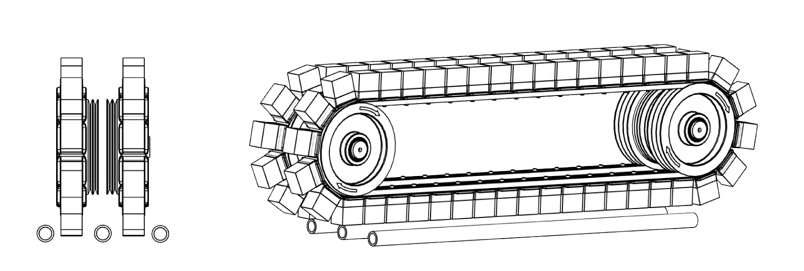 Três rolos de pressão (antes, entre e após os crossbelts) asseguram pressão e suporte contínuos